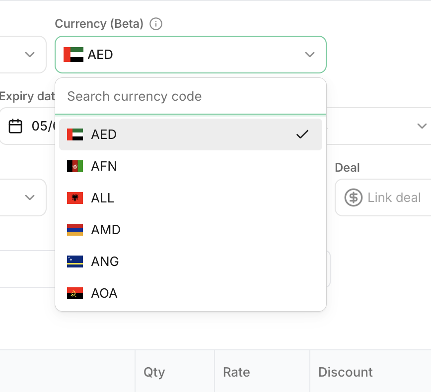 Choose the currency for an invoice with a searchable picker and flags, and work with client-level currency preferences so amounts match how you bill and get paid.
